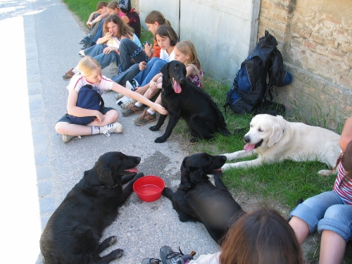Die weise Gina, meine Halbschwester. Dieses ehrgeizige Frauenzimmer - übrigens eine Halbschwester von mir - hat uns das alles eingebrockt. Das mit dem vielen Arbeiten. Von wegen Rettungshunde! Da musst du auf Befehl durch den Wald hirschen, nicht um Rehe oder Hasen zu jagen, nein um Menschen zu suchen. Wer will den das? Teddy war der einzige von unserem Quartett, der sich durchgesetzt hat. Wie? Ganz einfach. Ihr wollt dass ich auf Leitern gehe und über Wippen und so Zeug? Mit mir nicht - ich bleibe stehen, solange bis ihr aufgebt. Siehe da- es hat funktioniert. Er musste keinen retten. Dann hat er sich aber einen anderen Blödsinn eingehandelt. Er hat sich gerne streicheln lassen. Wie erreiche ich, dass mich alle streicheln? Ich mache eine Therapiehundeausbildung und da bekomme ich fürs gestreichelt werden auch noch Leckerli. Na gut, wenn er das so will soll's ja recht sein. Aber dass sein Herrl gleich einen Verein gründet (übrigens mit seinem Kopf im Logo ;-) davon war ja nie die Rede. Was ist uns Schwarzen übrig geblieben? Zuerst wirst Rettungshund, dann Therapiehund und dann gehst arbeiten, arbeiten, arbeiten, ...