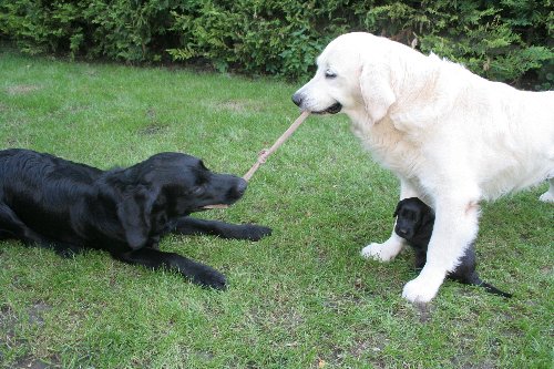 5 Monate alt. Futter gab's, es war später Nachmittag, wir waren ein großes Rudel mit Golden, Flats, Spaniels, Dackeln, etc. Alle standen vor dem großen Eisentor - die Trennung zwischen großer Spielwiese und den Futternäpfen. Sie warteten darauf, dass das Tor endlich aufging. Ich konnte mich aber von der Wiese so schwer trennen, da waren noch so viele verschiedene Düfte, Verstecke, etc. Also ich mitten auf der Wiese, alle anderen (ca. 30-35 Vierbeiner) drängten sich vor dem Tor. Aber das war ja eh noch zu! Dann - Hannes kam und sperrte langsam das Tor auf. Jetzt dürft ihr raten wie man als Letzter von der Wiese als Erster zu den Schüsseln kommt. Keine Idee? Soll ich es verraten? Aber nicht nachmachen! Versprochen?